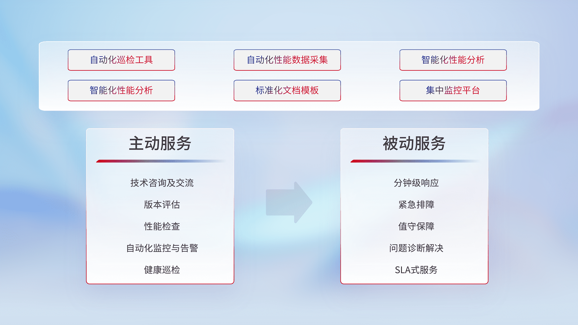 智能化工具和标准化文档,,,,保障服务质量,,,,提供主动服务(包含技术咨询、、、版本评估、、、性能检查、、、、自动化监控与告警、、、健康巡检)和被动服务包含(分钟级响应、、、、紧急排障、、值守保障、、、、问题诊断解决、、SLA服务)。。。